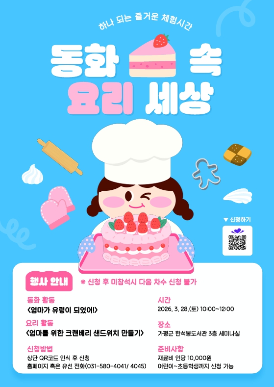 ![]() ○ 강의개요 - 운영일시: 2026. 3. 28.(토) 10:00~12:00 - 운영장소: 한석봉도서관 3층 세미나실 - 참여대상: 초등학생 - 참가비용: 재료비 인당 1만원 - 강의내용 동화 활동<엄마가 유령이 되었어!> 요리 활동<크랜베리샌드위치>만들기 ※ 신청 후 미참석시 다음 차수 신청 불가 |