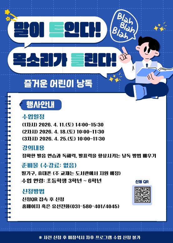 ![]() ○ 강의개요 - 운영일시: 2026. 4. 11.(토) 14:00~15:30 2026. 4. 18.(토) 10:00~11:30 2026. 4. 25.(토) 10:00~11:30 - 운영장소: 한석봉도서관 3층 세미나실 - 참여대상: 초등학생 3학년~6학년 - 참가비용: 없음. (도서관에서 책 지원예정) - 준비물: 필기구, 휴대폰 - 강의내용: 정확한 발음 연습과 독해력, 발표력 향상시키는 낭독 수업 ※ 신청 후 미참석시 다음 차수 신청 불가 |