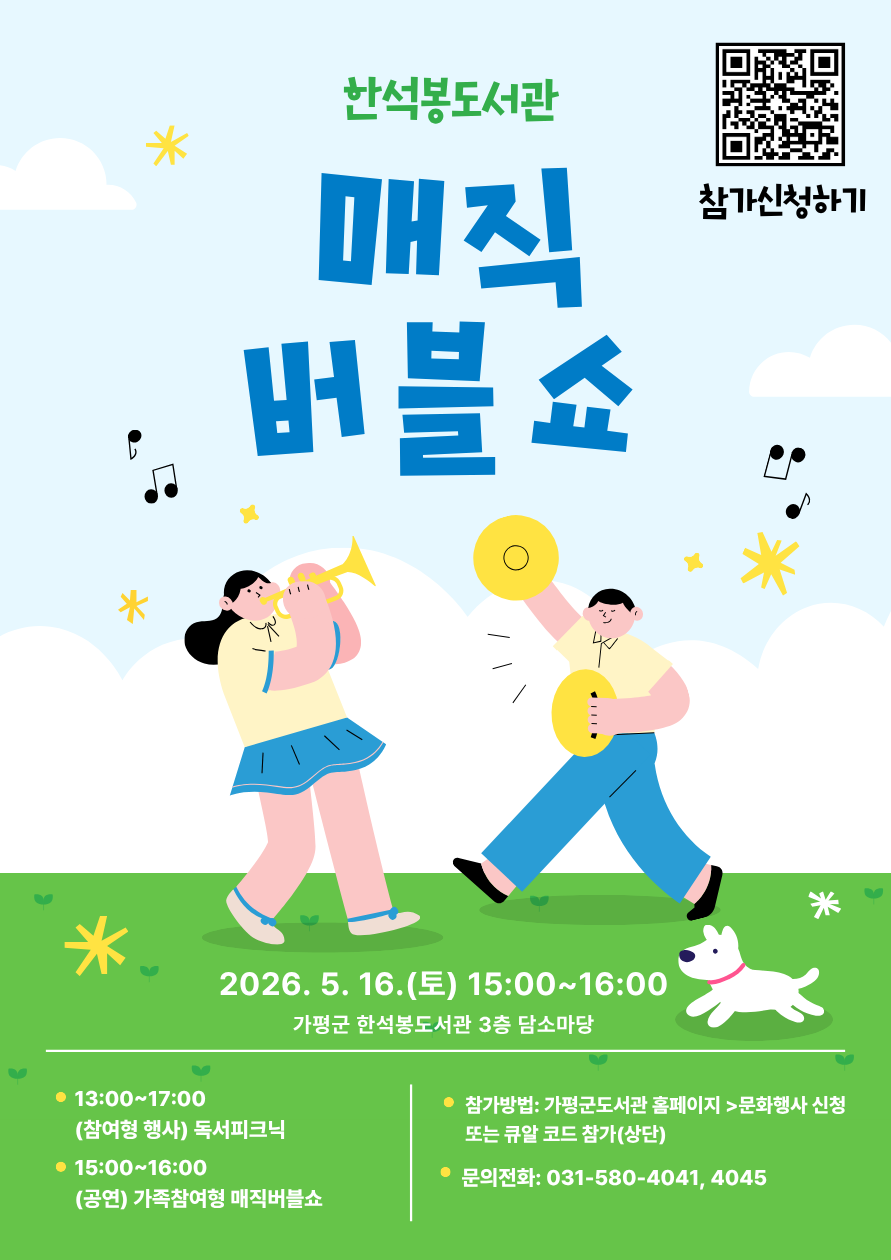 버블을 이용한 가족 참여형 마술 공연입니다. ㅇ 공연 개요 - 운영일시: 2026. 5. 16.(토) 15:00~16:00 2025. 9. 27.(토) 14:00 ~ 14:50 - 운영장소: 가평군 한석봉도서관 3층 담소마당(가평읍 소재) - 참여대상: 가평군민 누구나 - 참가비용: 무료 - 공연내용: 매직버블쇼 ※야외공연으로, 우천시 장소 변경 될 가능성 있음 |