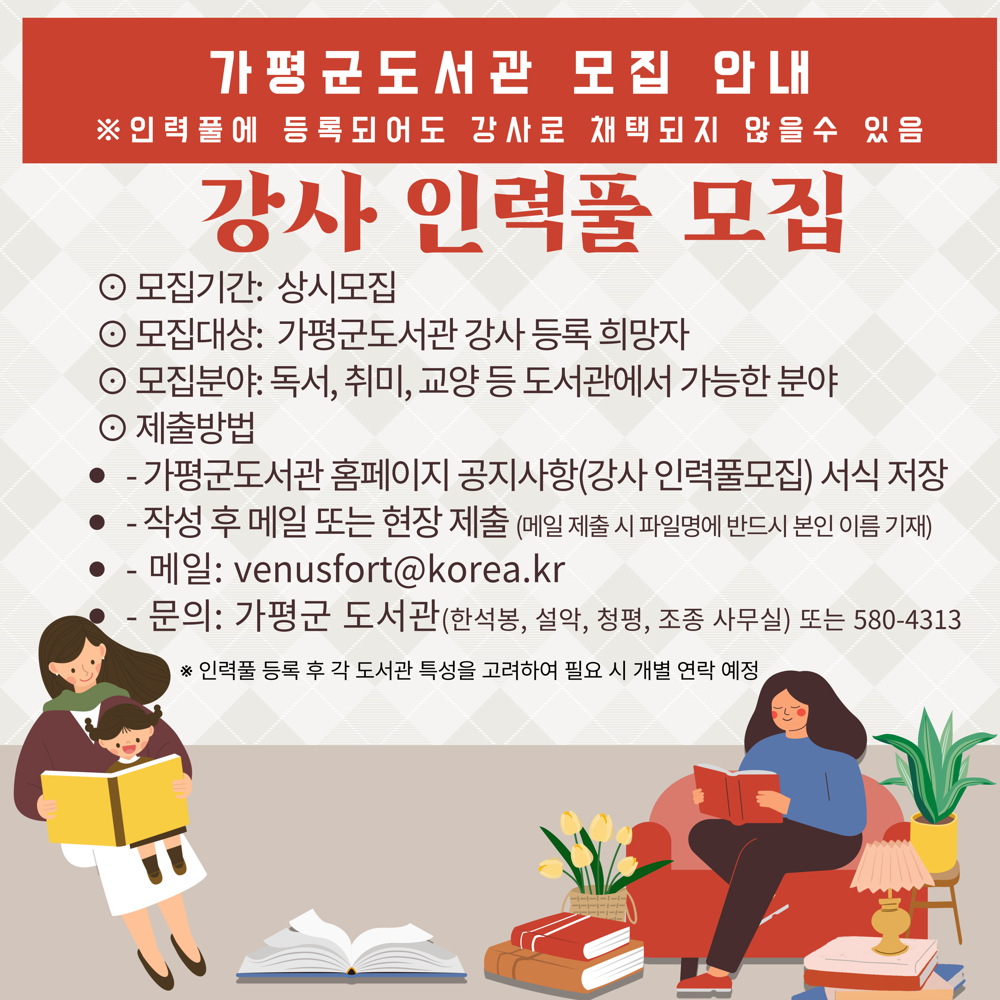 가평군도서관 문화 프로그램을 운영할 강사 인력풀을 모집합니다. ※ 문화 프로그램 운영에 적합한 사람을 미리 확보하는 것으로, 인력풀에 등록되어도 강사로 채택되지 않을 수 있음 ㅇ 모집기간: 상시 모집 ㅇ 모집대상: 가평군도서관 강사 등록 희망자 ㅇ 신청방법: 첨부 파일(필수: 강사인력풀 참여신청서, 선택: 강의계획서) 작성 후, 메일 또는 서류 방문 제출 ※ 메일 접수 시 파일명에 반드시 본인 이름 기재 ex) (필수) 강사인력풀 참여신청서(홍길동).hwp , (선택) 강의계획서(홍길동).hwp - 메일주소: venusfort@korea.kr - 서류제출: 도서관 4개소(한석봉, 설악, 청평, 조종) ㅇ 문 의 처 : 가평군 평생교육사업소 도서관팀(☎031-580-4313)
