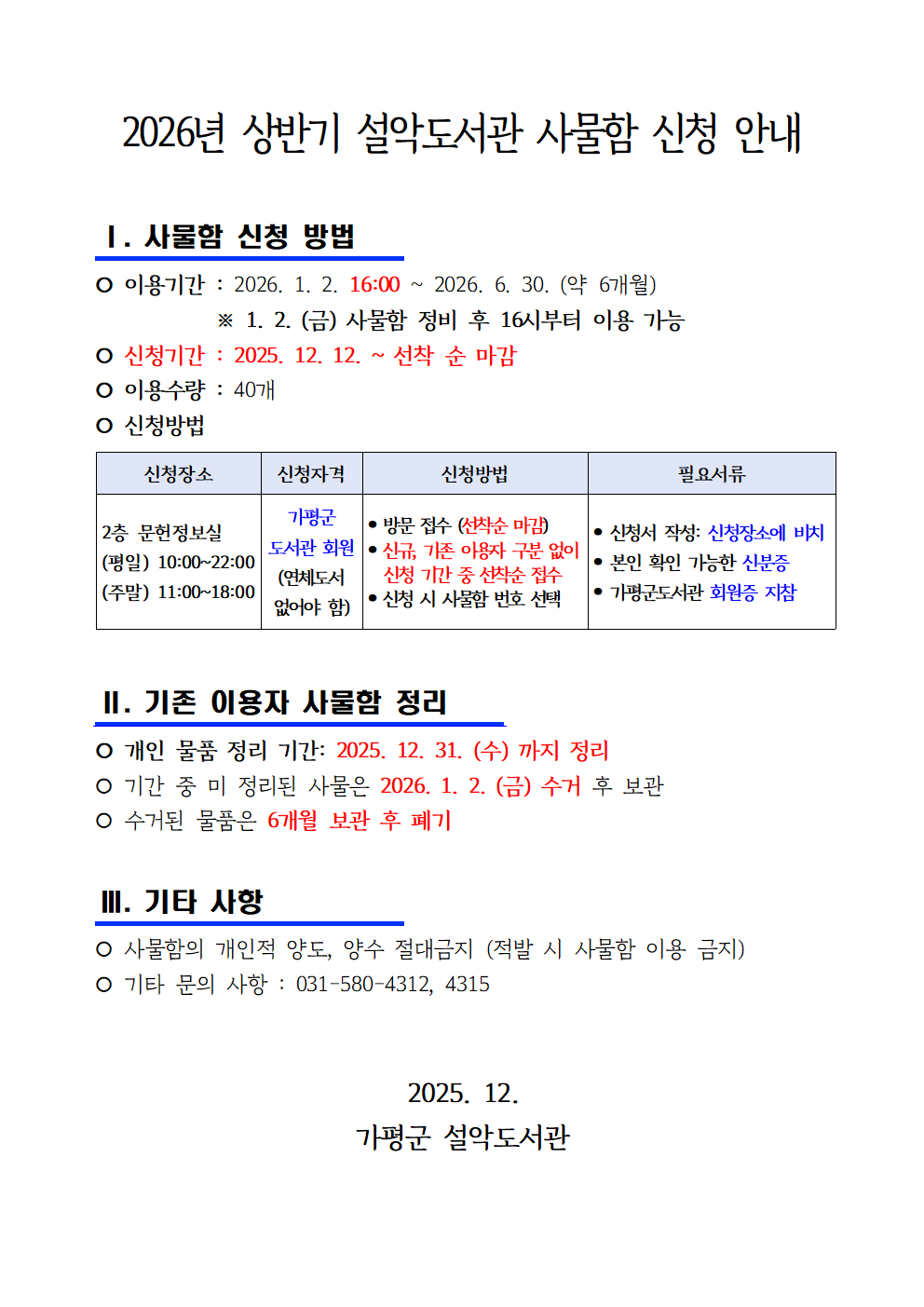 설악도서관 2026년도 상반기 사물함 신청 안내