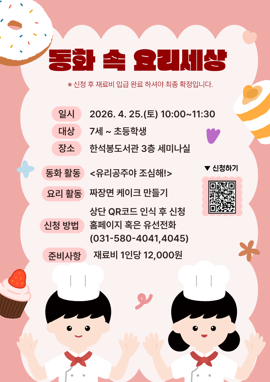 ![]() ○ 강의개요 - 운영일시: 2026. 4. 25.(토) 10:00~12:00 - 운영장소: 한석봉도서관 3층 세미나실 - 참여대상: 7세~초등학생 - 참가비용: 재료비 인당 12,000원 - 강의내용 동화 활동<유리공주야 조심해!> 요리 활동<짜장면 케이크>만들기 ※ 6세이하는 수업 참여에 어려움이 있어 신청 불가입니다. |
